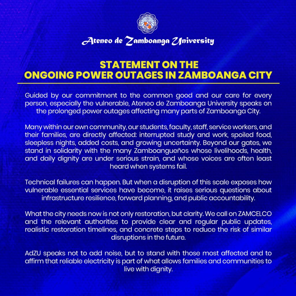 READ | Ateneo de Zamboanga University’s Statement on the Ongoing Power Outages in Zamboanga City March 27, 2026 Ateneo de Zamboanga University expresses serious concern over the prolonged power outages affecting many parts of Zamboanga City. Many within our own community, our students, Read More »